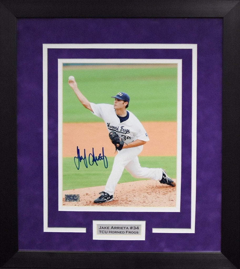 Jake Arrieta, former star pitcher for the TCU Horned Frogs, has hand signed this 8x10 photo at a private signing. It comes professionally framed in a black wood frame and double matted in TCU colors. This item comes with a certificate of authenticity (COA) from Signature Sports Marketing, one of the leaders in the industry. You will receive a paper COA along with matching serial-numbered holograms.Item pictured may not be the exact item you will receive. It will be similar quality, and we guarantee your satisfaction.