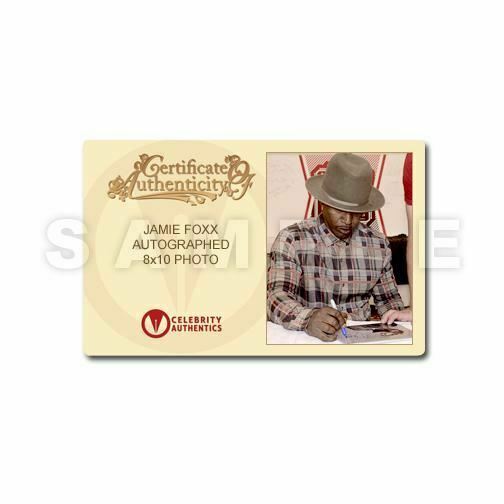 This incredible 8x10 photo from Ray has been personally hand-signed by Jamie Foxx during his signing with Celebrity Authentics. Classic shot of Jamie in his Academy Ward Wining performance as the legendary Ray Charles. Ships affixed with Celebrity Authentics serial-numbered and tamper evident Authentication Hologram and includes Celebrity Authentics Certificates of Authenticity featuring picture of Jamie signing photo. Please note: with multiples signed by the actor, a sample photo is used from stock to represent what you will receive. Exact autograph size and placement may vary.