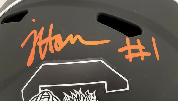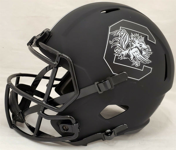 This is an Eclipse Black South Carolina Gamecocks Replica Speed Full Size Helmet that has been hand signed by Jaycee Horn. Horn signed the top of this helmet as shown. This item has been certified authentic by Beckett (BAS) and comes with their tamper-proof sticker and matching certificate of authenticity. NOTE: The Eclipse Black helmets are very delicate and often have some marks or scratches on them.