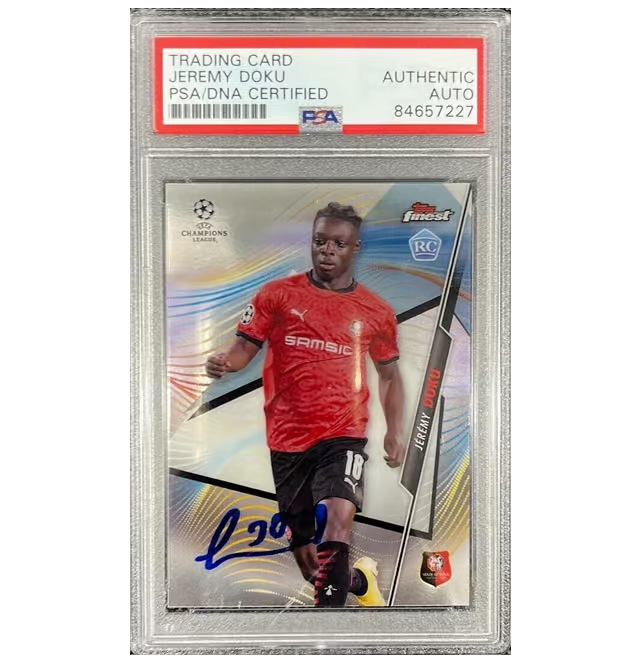 This is a Jeremy Doku Signed 2020-21 Topps UCL Finest Rookie #40 - PSA Authentic. THE ITEM IN THE PICTURE IS A STOCK IMAGE. YOU WILL RECEIVE AN IDENTICAL ITEM OF EQUAL QUALITY. ALL JERSEYS ARE SIZE LARGE. Every item of signed memorabilia we sell is official and of the highest quality. We pride ourselves on providing sports fans with the most exclusive signed memorabilia on the market. We are an industry leading signed memorabilia company who can guarantee 100% authenticity on every signature we sell. The item you receive will be identical to the one you are seeing in the stock pictures. This includes the item, the authentication company, signature color and signature placement. We take pride in ensuring the authenticity of all our items. With unwavering commitment, we guarantee that every signature is 100% authentic. Every item of signed memorabilia comes with a scannable barcode which takes you to the certificate of authenticity on the company's website. These industry leading authentication companies include Beckett Authentication Services, James Spencer Authentication Services and Professional Sports Authentication Services.