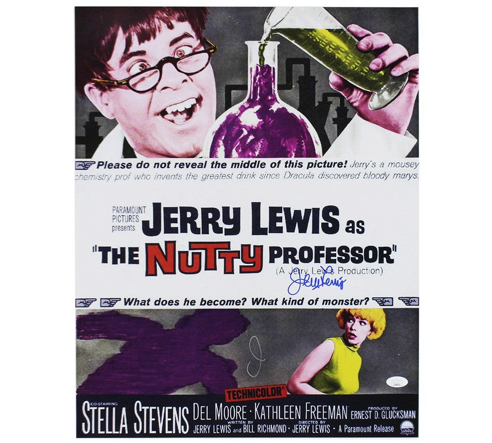 An Unframed 16x20 The Nutty Professor Movie Poster hand signed by Jerry Lewis. The item and signature are in excellent condition. Jerry Lewis was a legendary American comedian, actor, singer, filmmaker, and humanitarian. Rising to fame in the 1940s as part of the comedy duo Martin and Lewis with singer Dean Martin, he became known for his zany, slapstick humor and distinctive voice. After the duo split in 1956, Lewis went on to a successful solo career, starring in and directing a series of hit comedies, including The Bellboy and The Nutty Professor. AUTHENTICATION: The item is accompanied by a JSA Certificate of Authenticity - JSA Serial Numbered Hologram -