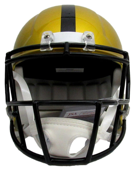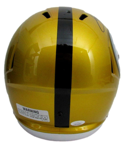 Joe greene hof pittsburgh steelers signed/inscribed "hof 87" full size gold flash replica football helmet. this helmet is authenticated by jsa and includes their tamper-proof sticker and certificate of authenticity.