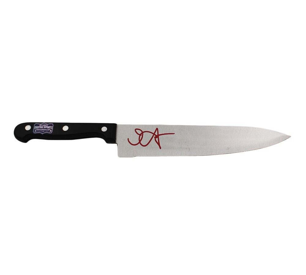 A 12 Inch Prop Knife-Red Ink Hand signed By John Carpenter. The Item and Signature are in excellent Condition. John is an American filmmaker, he is most known for his horror films such as Halloween being one of his biggest ones. AUTHENTICATION: Your item is tagged with a SmarTag powered by Prova Technology, which gives you digital access to your items authentication records.