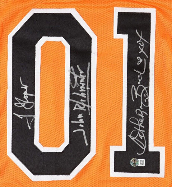 Custom Dukes of Hazzard jersey with everything sewn on, size XL. Hand-signed and inscribed by John Schneider (Bo Duke), Catherine Bach (Daisy Duke), and Tom Wopat (Luke Duke).The autograph includes an official Beckett Authentication Services serially numbered hologram and QR Code Card for authenticity purposes. The signing of this item was witnessed by Beckett.Authentication: Beckett Hologram with QR Code Card