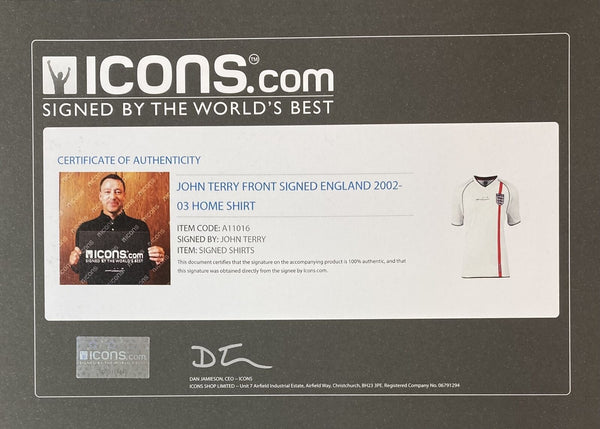 Featured is a John Terry signed 2002/03 England soccer jersey. This jersey has been hand signed by Terry and comes with the Icons hologram and certificate of authenticity, along with the Fanatics hologram. This jersey is size L. This jersey would make a great addition to any sports memorabilia collection!. SPECIFICATIONS Autographed By: John Terry Team: England Sport: Soccer Authentication: Fanatics Authentic