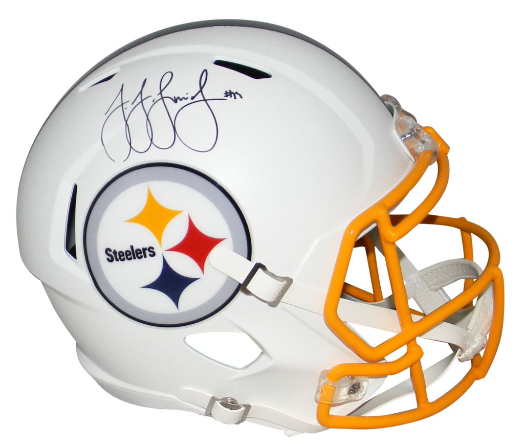 JuJu Smith-Schuster, star wide receiver for the Pittsburgh Steelers, has hand signed this Steelers Riddell Speed Flat White full-size replica helmet at a private signing. This item comes with a certificate of authenticity (COA) from Beckett Authentication Services and was signed in the presence of one of their representatives. You will receive a serial-numbered COA along with a matching serial-numbered sticker on the helmet. The authenticity can be verified online by entering the serial number.Item pictured may not be the exact item you will receive. It will be similar quality, and we guarantee your satisfaction.