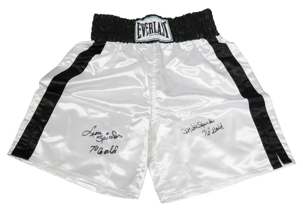 Leon Spinks and Michael Spinks dual signed Everlast white boxing trunks with each guy including '76 Gold' inscription. Item comes with a Schwartz Sports Memorabilia tamper-proof numbered hologram and Certificate of Authenticity which can be verified online.