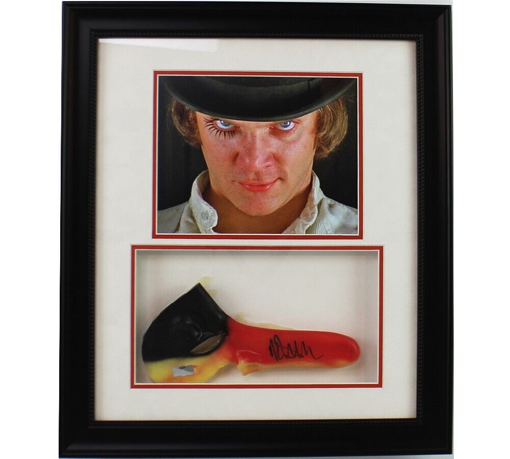A Framed Clockwork Orange Rubber Mask hand signed by Malcom McDowell. The item and signature are in excellent condition. The frame measures approximately 19"x 22"x 2" and features an 8x10 Photo. Mr. McDowell is most famous for his role in A Clockwork Orange, but he has had multiple television and movie appearance since he started acting in 1968. AUTHENTICATION: The item is accompanied by a Certificate of Authenticity - Serial Numbered and Databased Hologram