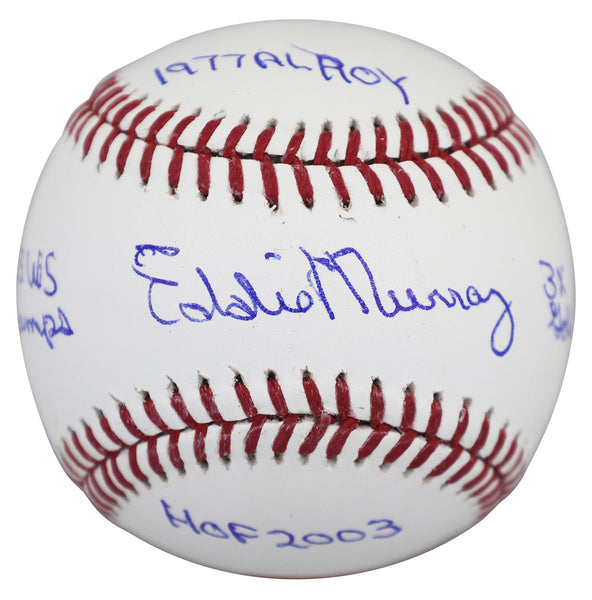 This Autographed Robert Manfred Baseball with the inscription of "HOF 2003, 1983 WS Champs, 1977 AL ROY, 3x Gold Glove" has been Personally Signed by Eddie Murray of the Baltimore Orioles. This item is 100% Authentic to include a hologram by Beckett Authentication Services. This item will come with an affixed Beckett Authentication Services (BAS) authentication sticker, which includes a scannable QR code to verify authenticity. Please note that Beckett no longer provides serial-numbered COA cards, and the attached BAS sticker will serve as the complete authentication for this item. This is a BAS Witnessed Protection Program item which means a Beckett Authentication Service representative was present when this item was being signed. We conducted an autograph signing with Eddie Murray where multiples of the same item were signed. While the photographs are representative of this item, the size, placement and strength of the signature may vary. Each item is hand signed, therefore, each autograph is unique. This item can be verified through BAS Witnessed.