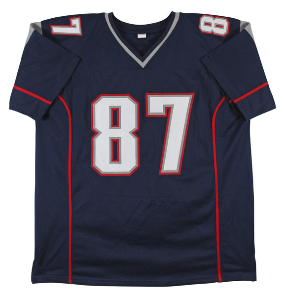 This Autographed Navy Blue Pro Style Jersey has been Personally Signed by Rob Gronkowski of the New England Patriots. This item is 100% Authentic to include a Certificate of Authenticity (COA) / hologram by JSA. We conducted an autograph signing with Rob Gronkowski where multiples of the same item were signed. While the photographs are representative of this item, the size, placement and strength of the signature may vary. Each item is hand signed, therefore, each autograph is unique. This item can be verified through JSA. This is a X-Large sized, non-branded, custom-stitched Jersey.
