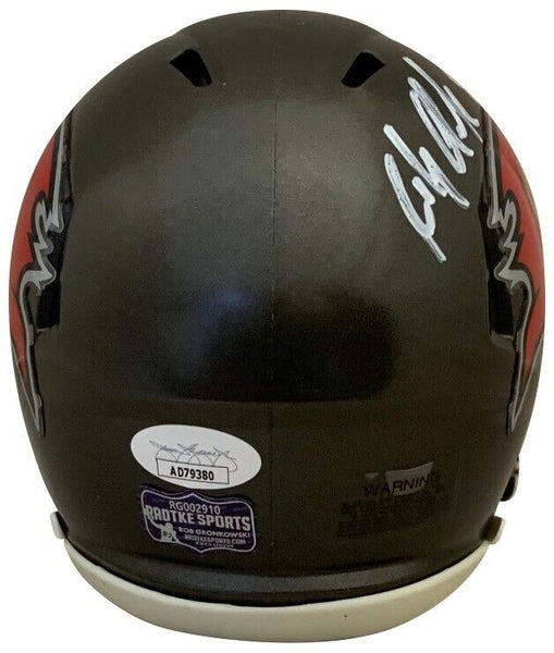 Rob Gronkowski has autographed this Tampa Bay mini helmet. Autograph is authenticated by JSA (James Spence Authentication) the leading authenticator of sports autographs. Comes with their unique sticker # fixed to the item and verified on their website. Also comes with their certificate of authenticity with same matching #.