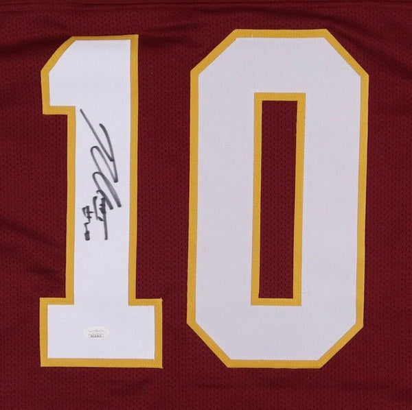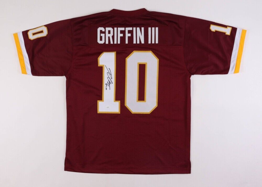 Custom on-field style jersey. Everything is sewn on, size XL. Hand-signed by Robert Griffin III.The lot / autograph(s) includes an official James Spence Authentication (JSA) hologram for authenticity purposes. The signing of this item was witnessed by JSA.Authentication: JSA Hologram