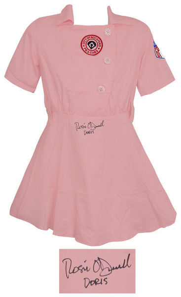 Rosie O'Donnell signed Rockford Peaches pink costume women's baseball jersey with 'Doris' character name inscription. The Rockford Peaches is the team Geena Davis' character Dottie Hinson played for in the hit movie A League of Their Own. Item comes with a Schwartz Sports Memorabilia tamper-proof numbered hologram and Certificate of Authenticity which can be verified online.