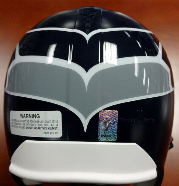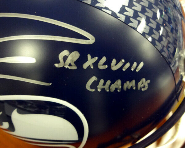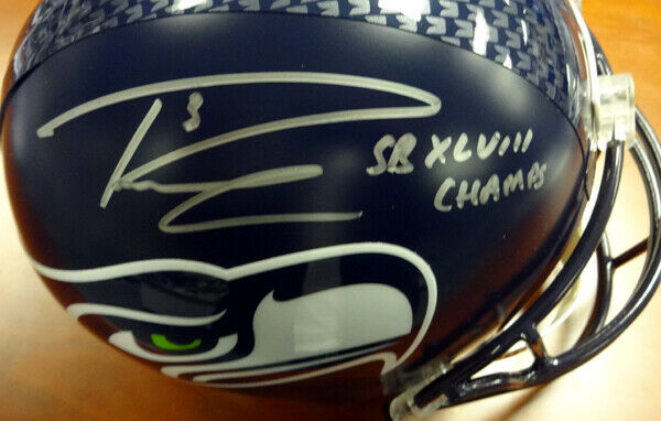 This is a Seattle Seahawks Full Size Replica Helmet that has been hand signed by Russell Wilson. Along with the autograph, this item also comes with the inscription which reads "SB XLVIII Champs". This one is signed in silver. This item has the official tamper-proof Russell Wilson serial numbered hologram and matching certificate of authenticity.