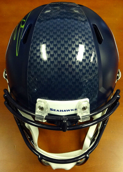 This is a Seattle Seahawks Full Size Replica Speed Helmet that has been hand signed by Russell Wilson. This one is signed in green. This item has the official tamper-proof Russell Wilson serial numbered hologram and matching certificate of authenticity.