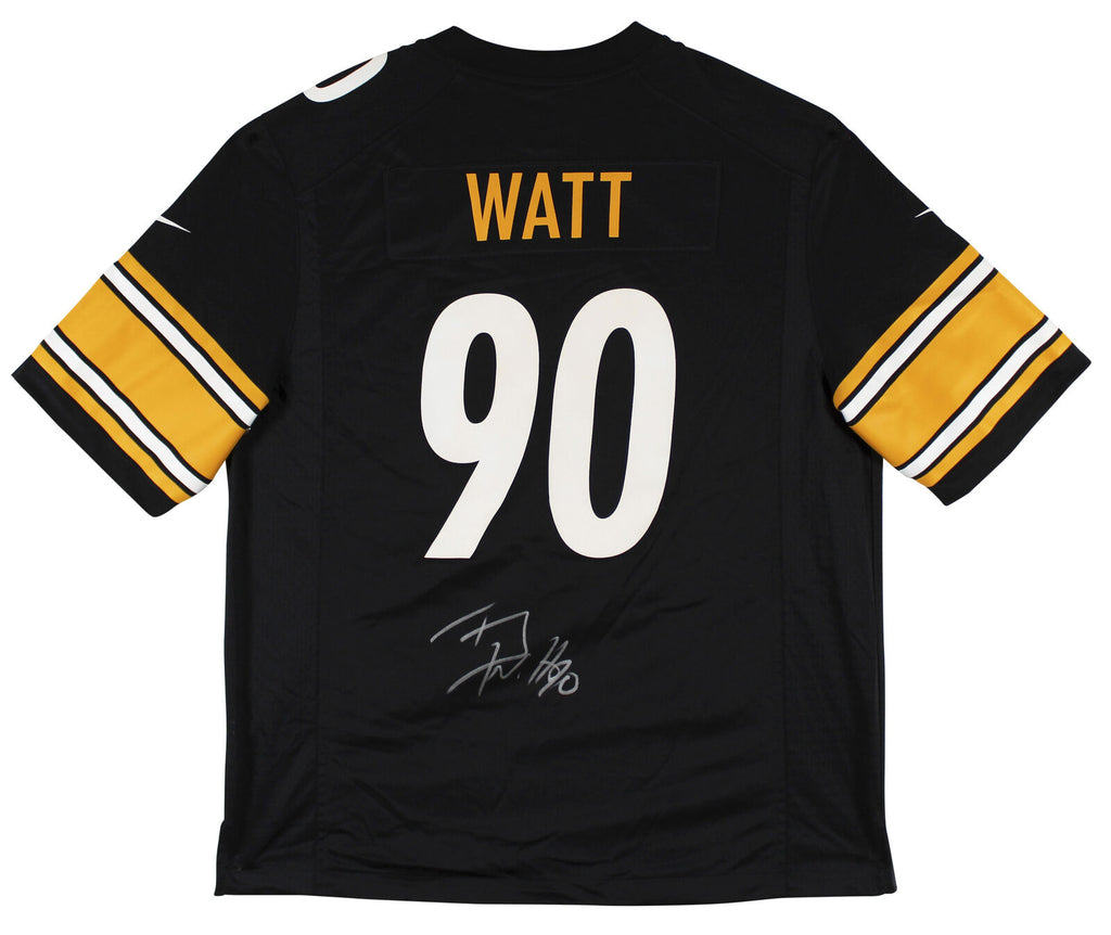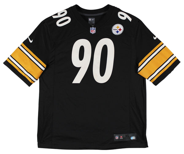 This Autographed w/ Silver Signature Black Nike Game Jersey has been Personally Signed by T.J. Watt of the Pittsburgh Steelers. This item is 100% Authentic to include a hologram by Beckett Authentication Services. This item will come with an affixed Beckett Authentication Services (BAS) authentication sticker, which includes a scannable QR code to verify authenticity. Please note that Beckett no longer provides serial-numbered COA cards, and the attached BAS sticker will serve as the complete authentication for this item. This is a BAS Witnessed Protection Program item which means a Beckett Authentication Service representative was present when this item was being signed. We conducted an autograph signing with T.J. Watt where multiples of the same item were signed. While the photographs are representative of this item, the size, placement and strength of the signature may vary. Each item is hand signed, therefore, each autograph is unique. This item can be verified through BAS Witnessed. This is a X-Large sized Jersey. There is some discoloration/toning to the numbers on these jerseys, please see the additional photo in the listing. It is hard to see in the main listing photos, as the majority of the toning is fairly consistent throughout the numbers.