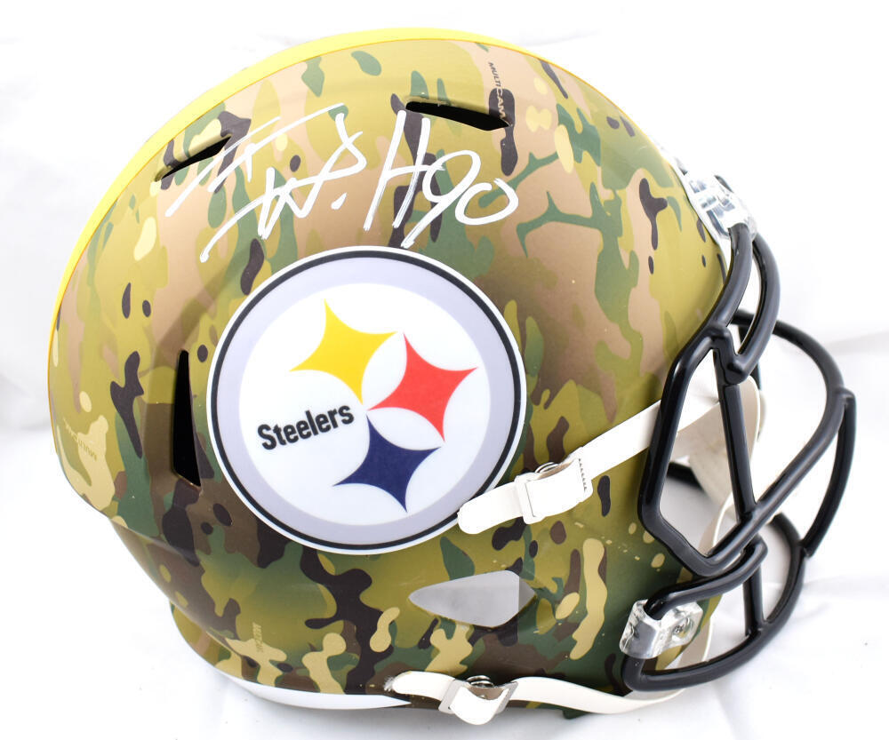 TJ Watt Autographed Pittsburgh Steelers F/S Camo Speed Helmet-Beckett W Hologram *White This is a hand autograph of TJ Watt of the Pittsburgh Steelers on a Riddell Football Full Size Camo Speed Replica Helmet. This item has a Beckett Witnessed Authentication, which comes with a numbered hologram and a QR code for verification. You can view this item on the Beckett Authentication website and it shows when and where the item was signed. It was signed either at a public autograph appearance or a private signing. This is a stock photo of the item. Although you may not receive this exact item, the item you receive is virtually identical and brand new in great shape.