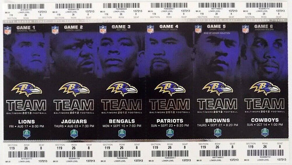 Featured is a complete set of 2012 Baltimore Ravens home season tickets games 1-6. This was the season the Ravens won the Super Bowl, which was also Ray Lewis' final season as a pro. SPECIFICATIONS Autographed By: Team: Sport: Football Authentication: