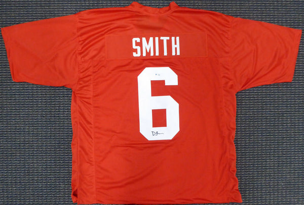This is a Red Jersey that has been hand signed by Devonta Smith. This is a custom jersey with no name brand. The approximate size is XL. It has nice sewn in name and numbers. This item has been certified authentic by Beckett Authentication (BAS) and comes with their tamper-proof sticker and matching certificate of authenticity.