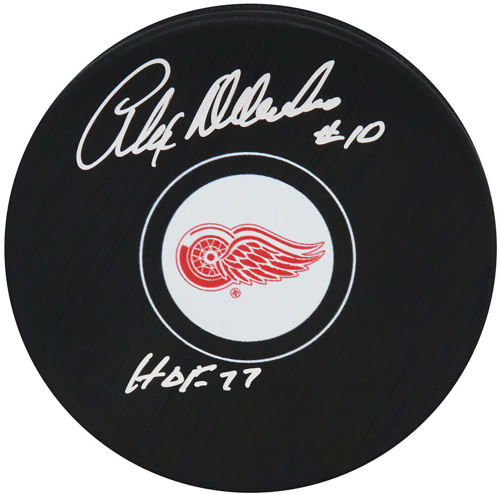Alex Delvecchio signed Detroit Red Wings team logo hockey puck with 'HOF 77' inscription. Item comes with a Schwartz Sports Memorabilia tamper-proof numbered hologram and Certificate of Authenticity which can be verified online.