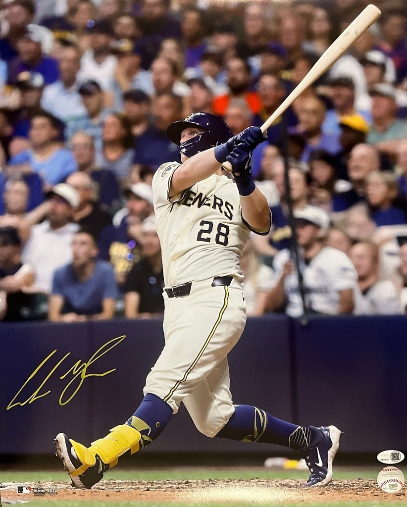 A 16x20 hand signed photo of Milwaukee Brewers Infielder ANDREW VAUGHN. The signature is in Yellow Paint Pen. This item was signed at a private signing with us. This would make a great addition to any BREWERS collection! This item is guaranteed to be 100% authentic and will include a COA from JSA authentication.
