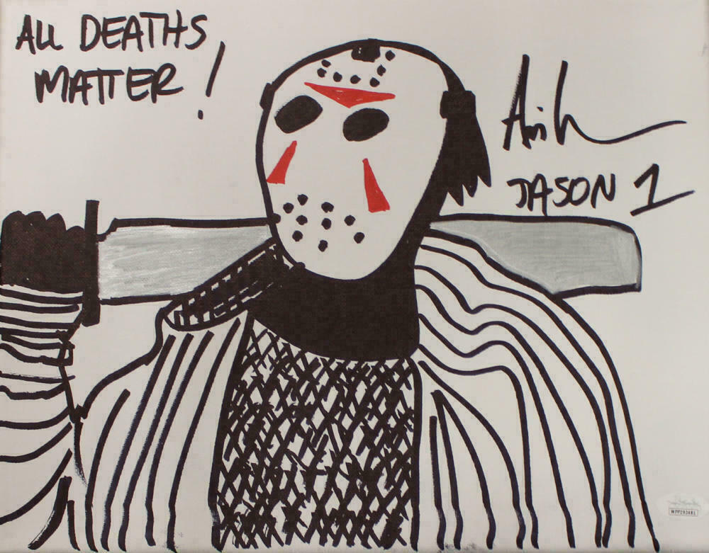 Ari Lehman Signed Friday The 13th Sketch 11x14 Canvas Deaths Matter JSA 22965 This is a Friday the 13thhand drawn sketch on 11x14 canvas that was personally drawn and autographed by the first Jason Voorhees, Ari Lehman with All Deaths Matter inscription. This is the exact item that you will receive so please see canvas for condition. Includes a certificate of authenticity from James Spence Authentication (JSA) and Denver Autographs.