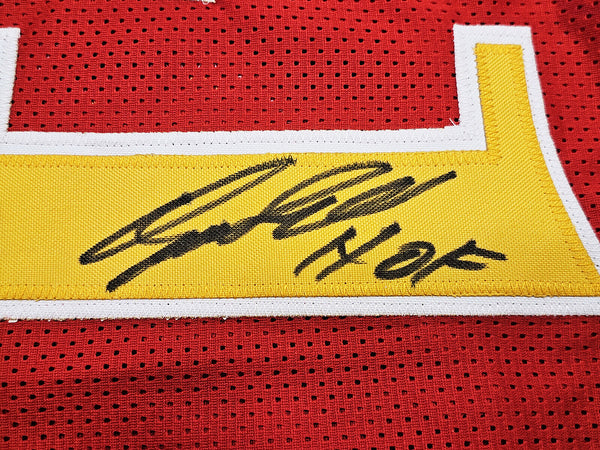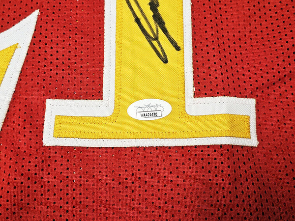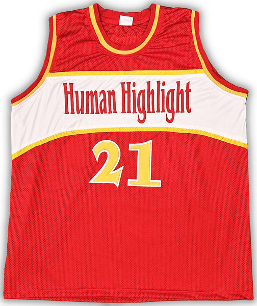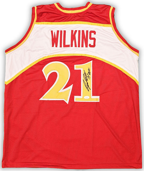 This is a Red Jersey that has been hand signed by Dominique Wilkins. This is a custom jersey with no name brand. The approximate size is XL. It has nice sewn in name and numbers. This item was inscribed "HOF." This item has been certified authentic by JSA and comes with their tamper-proof sticker and matching certificate of authenticity.