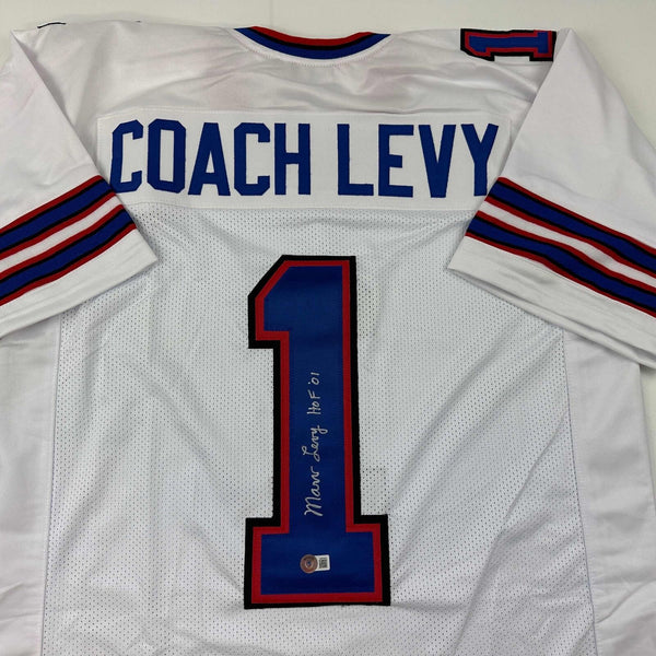 Autographed/Signed Coach Marv Levy HOF 01 Buffalo White Jersey Beckett BAS COA Jersey has no brand names or logos. This is a custom jersey and was not manufactured by or in any manner associated with any professional sports league or manufacturer. This custom jersey carries no professional sports league designation. The item is intended to be an autographed collectible. The custom jersey displays the name and number of the player. This item in no way is affiliated with or connected to any professional sports organization. Size is XL.