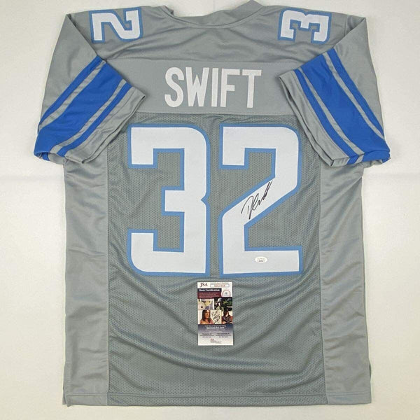 Autographed/Signed D'Andre Swift Detroit Grey Football Jersey JSA COA Jersey has no brand names or logos. This is a custom jersey and was not manufactured by or in any manner associated with any professional sports league or manufacturer. This custom jersey carries no professional sports league designation. The item is intended to be an autographed collectible. The custom jersey displays the name and number of the player. This item in no way is affiliated with or connected to any professional sports organization. Size is XL.