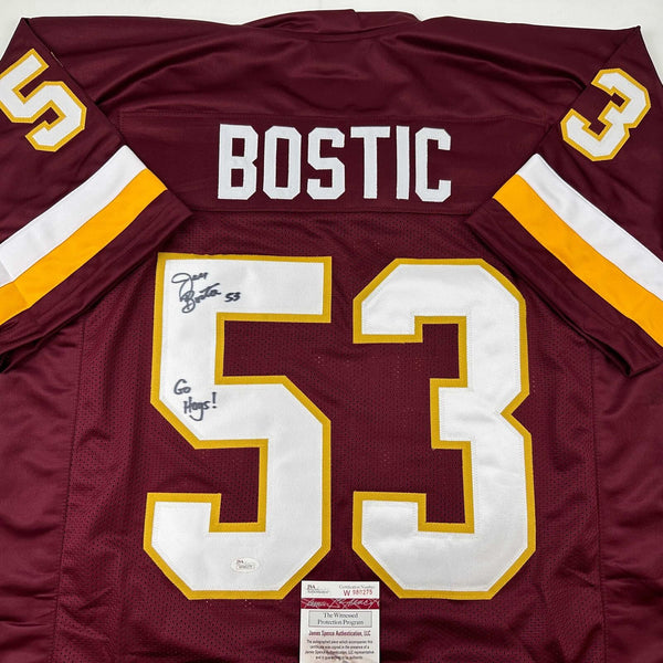 Autographed/Signed Jeff Bostic Washington Burgundy Football Jersey JSA COA Jersey has no brand names or logos. This is a custom jersey and was not manufactured by or in any manner associated with any professional sports league or manufacturer. This custom jersey carries no professional sports league designation. The item is intended to be an autographed collectible. The custom jersey displays the name and number of the player. This item in no way is affiliated with or connected to any professional sports organization. Size is XL.