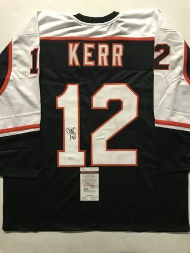 Autographed/Signed TIM KERR Philadelphia Black Hockey Jersey JSA COA Auto This is a custom jersey and was not manufactured by or in any manner associated with any professional sports league or manufacturer. This custom jersey carries no professional sports league designation. The item is intended to be an autographed collectible. Reference of team in the title is to allow the purchaser a point of association. The custom jersey displays the name, number and authenticated signature of the player. This item in no way is affiliated with or connected to any professional sports organization. The autograph, as always is guaranteed to be authentic and has been certified as authentic by a third-party, trusted authenticator. Size is XL unless otherwise noted.