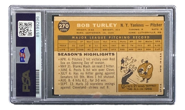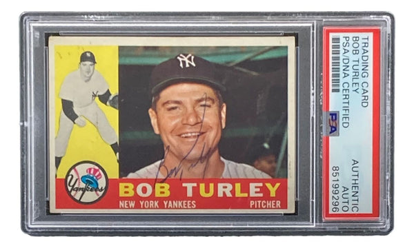Featured is a Bob Turley signed 1960 Topps #270 trading card. This card has been hand signed by Turley and has been authenticated and encapsulated by PSA/DNA. This card would make a great addition to any sports memorabilia collection!. SPECIFICATIONS Autographed By: Bob Turley Team: Sport: Baseball Authentication: Professional Sports Authenticator (PSA)