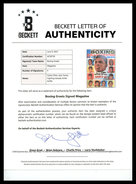 This is a Boxing Illustrated magazine that has been hand signed by Fighting Harada, Emile Griffith, Carlos Ortiz & Jose Torre. This item has been certified authentic by Beckett Authentication (BAS) and comes with their Tamper-Proof Hologram and matching full-page certificate of authenticity.
