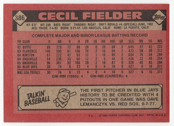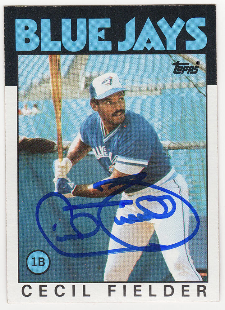 Cecil Fielder signed Toronto Blue Jays 1986 Topps baseball rookie card #386. Item comes with a Schwartz Sports Memorabilia tamper-proof numbered hologram (on back of physical card) and Certificate of Authenticity which can be verified online.