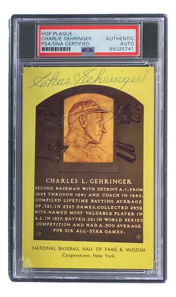 Featured is a Charlie Gehringer (Detroit Tigers) signed 4x6 Hall Of Fame plaque card. This card has been hand signed by Gehringer and has been authenticated and encapsulated by PSA/DNA. This card would make a great addition to any sports memorabilia collection!. SPECIFICATIONS Autographed By: Charlie Gehringer Team: Detroit Tigers Sport: Baseball Authentication: Professional Sports Authenticator (PSA)