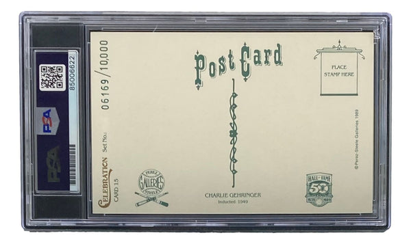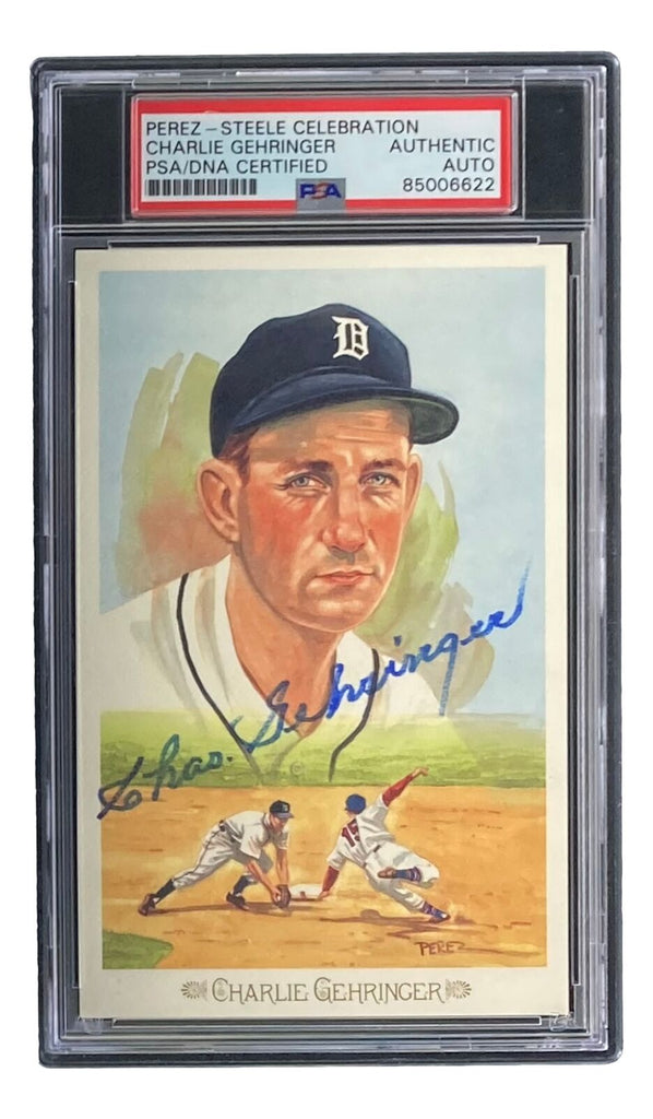 Featured is a Charlie Gehringer Detroit Tigers signed Perez-Steele postcard. This card has been hand signed by Gehringer and has been authenticated and encapsulated by PSA. This card would make a great addition to any sports memorabilia collection! SPECIFICATIONS Autographed By: Charlie Gehringer Team: Detroit Tigers Sport: Baseball Authentication: Professional Sports Authenticator (PSA)