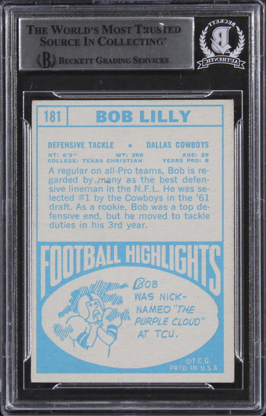 This Autographed 1968 Topps #181 Rookie Card with the inscription of "HOF 80, NFL Top 100" has been Personally Signed by Bob Lilly of the Dallas Cowboys. This item is 100% Authentic, it comes slabbed and authenticated by Beckett Authentication Services. The authenticity can be verified on Beckett Authentication Services website.