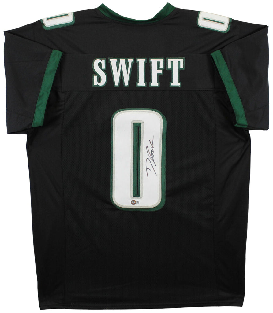 This Autographed Black Pro Style Jersey has been Personally Signed by D'Andre Swift of the Philadelphia Eagles. This item is 100% Authentic to include a hologram by Beckett Authentication Services. This item will come with an affixed Beckett Authentication Services (BAS) authentication sticker, which includes a scannable QR code to verify authenticity. Please note that Beckett no longer provides serial-numbered COA cards, and the attached BAS sticker will serve as the complete authentication for this item. This is a BAS Witnessed Protection Program item which means a Beckett Authentication Service representative was present when this item was being signed. We conducted an autograph signing with D'Andre Swift where multiples of the same item were signed. While the photographs are representative of this item, the size, placement and strength of the signature may vary. Each item is hand signed, therefore, each autograph is unique. This item can be verified through BAS Witnessed. This is a X-Large sized, non-branded, custom-stitched Jersey.