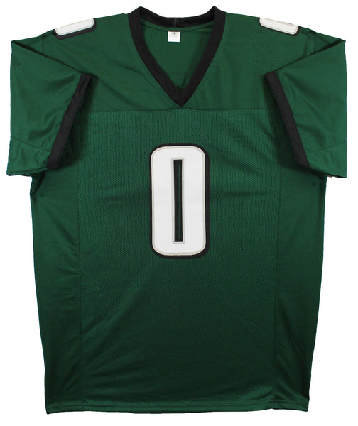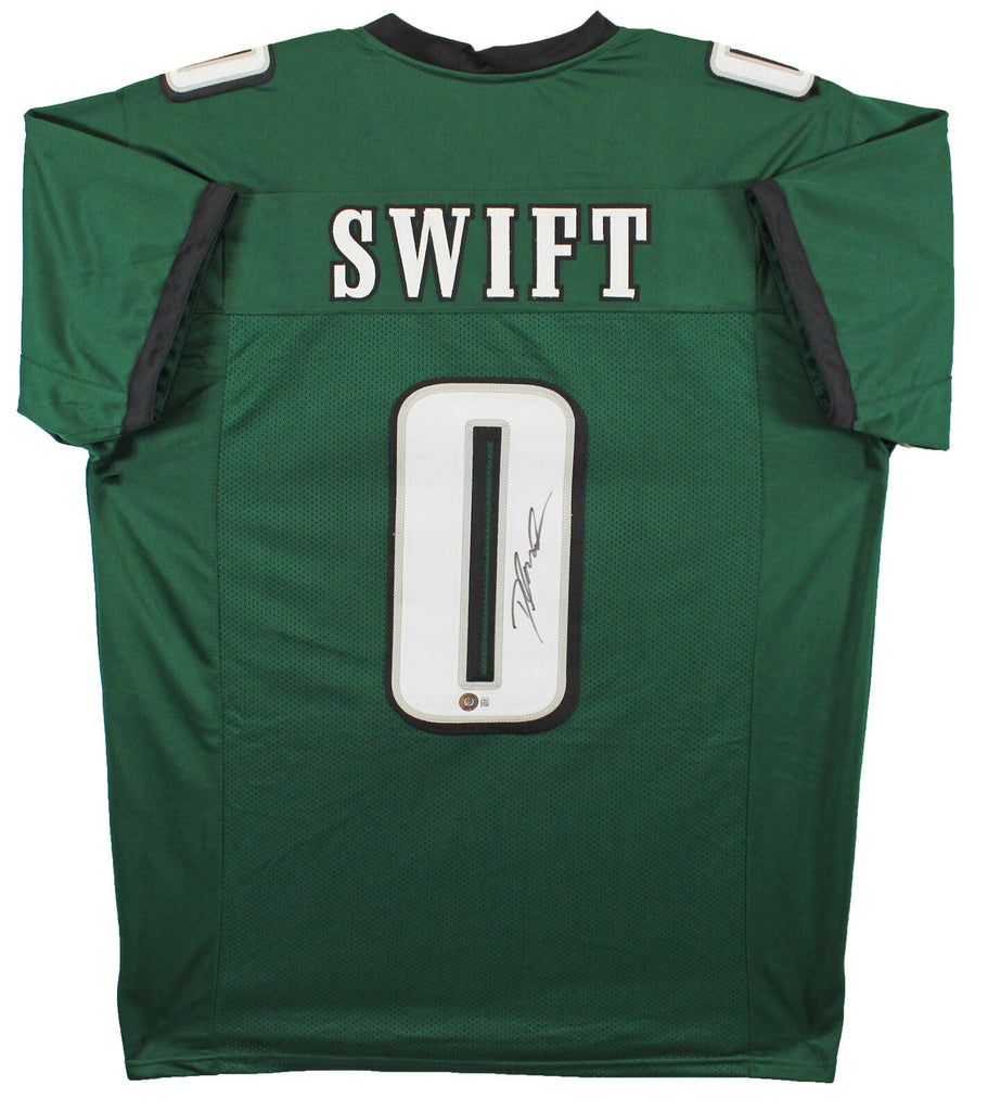 This Autographed Green Pro Style Jersey has been Personally Signed by D'Andre Swift of the Philadelphia Eagles. This item is 100% Authentic to include a hologram by Beckett Authentication Services. This item will come with an affixed Beckett Authentication Services (BAS) authentication sticker, which includes a scannable QR code to verify authenticity. Please note that Beckett no longer provides serial-numbered COA cards, and the attached BAS sticker will serve as the complete authentication for this item. This is a BAS Witnessed Protection Program item which means a Beckett Authentication Service representative was present when this item was being signed. We conducted an autograph signing with D'Andre Swift where multiples of the same item were signed. While the photographs are representative of this item, the size, placement and strength of the signature may vary. Each item is hand signed, therefore, each autograph is unique. This item can be verified through BAS Witnessed. This is a X-Large sized, non-branded, custom-stitched Jersey.