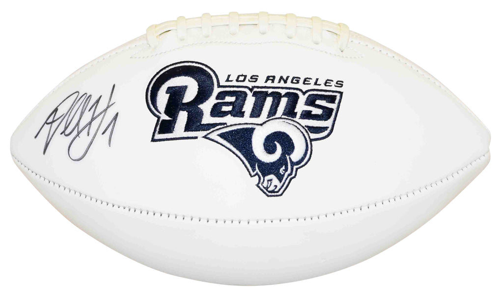 Darrell Henderson Jr, star running back for the Los Angeles Rams, has hand signed this Rams white panel logo football at a private signing. This item is authenticated by Beckett Authentication Services and was signed in the presence of one of their representatives. Their tamper-evident hologram featuring a QR code and serial number is on the item. The authenticity can be verified online by entering the serial number or scanning the QR code.Item pictured may not be the exact item you will receive. It will be similar quality, and we guarantee your satisfaction.