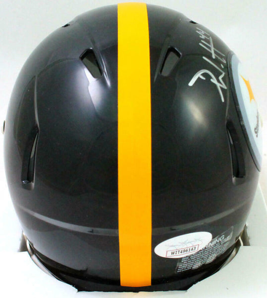 Derek Watt Autographed Pittsburgh Steelers Speed Mini Helmet - JSA W Auth *Silver This is a hand autograph of Derek Watt of the Pittsburgh Steelers on a Riddell Football Speed Mini Helmet. This item has a James Spence Witness Protection Authentication, which comes with a numbered sticker and a matching JSA Certificate of Authenticity. You can view this item on the SpenceLOA website and it shows when and where the item was signed. It was signed either at a public autograph appearance or a private signing. This is a stock photo of the item. Although you may not receive this exact item, the item you receive is virtually identical and brand new in great shape.