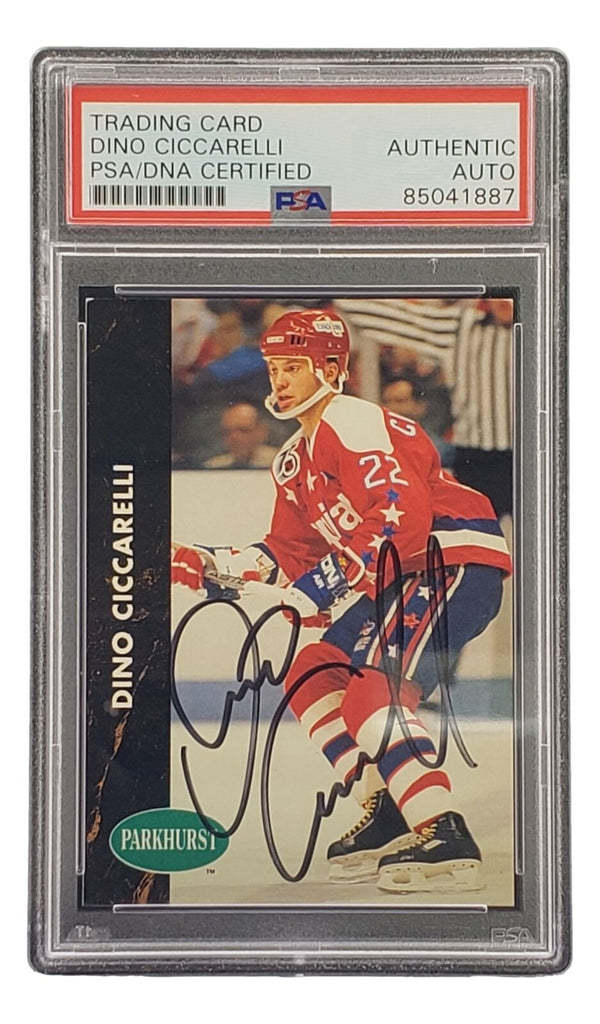 Featured is a Dino Ciccarelli signed 1991 Pro Set #193 Washington Capitals hockey card. This card has been hand signed by Ciccarelli and has been authenticated and encapsulated by PSA. This card would make a great addition to any sports memorabilia collection. SPECIFICATIONS Autographed By: Dino Ciccarelli Team: Washington Capitals Sport: Hockey Authentication: Professional Sports Authenticator (PSA)