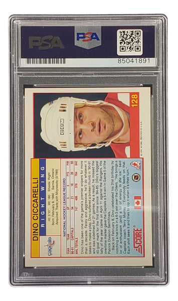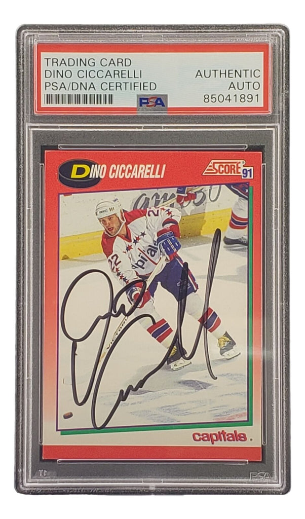 Featured is a Dino Ciccarelli signed 1991 Score #128 Washington Capitals hockey card. This card has been hand signed by Ciccarelli and has been authenticated and encapsulated by PSA. This card would make a great addition to any sports memorabilia collection. SPECIFICATIONS Autographed By: Dino Ciccarelli Team: Washington Capitals Sport: Hockey Authentication: Professional Sports Authenticator (PSA)