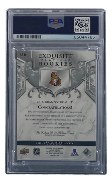 Featured is a Erik Brannstrom signed 2019 Upper Deck Exquisite #R16 Ottawa Senators trading card. This card has been hand signed by Brannstrom and has been authenticated and encapsulated by PSA. This card would make a great addition to any sports memorabilia collection!. SPECIFICATIONS Autographed By: Erik Brannstrom Team: Sport: Hockey Authentication: Professional Sports Authenticator (PSA)