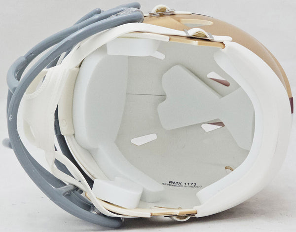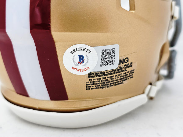 This is a San Francisco 49ers Gold Speed Mini Helmet that has been hand signed by Frank Gore. This item has been witnessed and certified authentic by Beckett Authentication (BAS) and comes with their tamper-proof witness sticker.