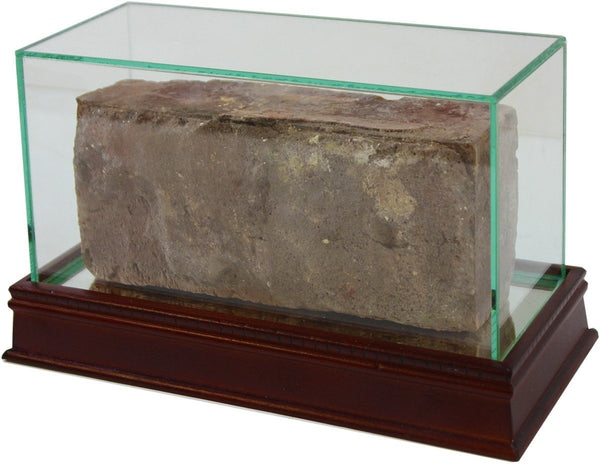 Our Glass Brick Display Cases are a necessity for any committed sports memorabilia enthusiast. Your timeless pieces whether autographed hats balls or bricks will be safe from dust and fading with our top-of-the-line exquisitely crafted cases. Each UV-protected (Ultra Violet protected) display case is hand-made and includes a removable glass top for easy access. With a mirrored bottom and stunning cherry wood base your memorabilia will look stylish and protected in any setting. The dimensions of this outer base are 10 inches wide, 4 inches deep, and 5 inches tall.