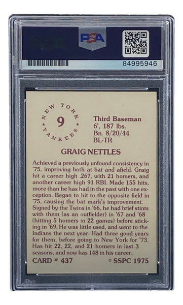 Featured is a Graig Nettles New York Yankees signed 1975 SSPC #437 trading card. This card has been hand signed by Guidry and has been authenticated and encapsulated by PSA. This card would make a great addition to any sports memorabilia collection!. SPECIFICATIONS Autographed By: Graig Nettles Team: Sport: Baseball Authentication: Professional Sports Authenticator (PSA)