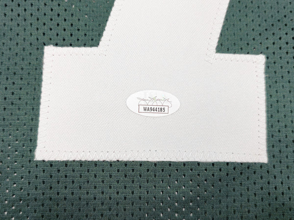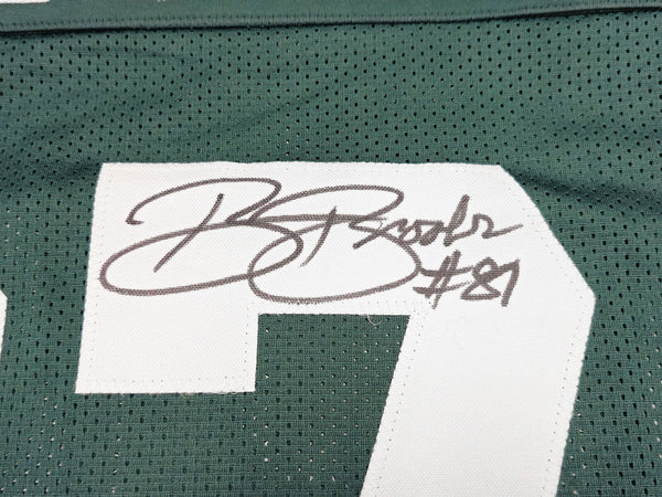 This is a Green Jersey that has been hand signed by Robert Brooks. This is a custom jersey with no name brand. The approximate size is XL. It has nice sewn in name and numbers. This item has been certified authentic by JSA and comes with their tamper-proof hologram and matching certificate of authenticity.
