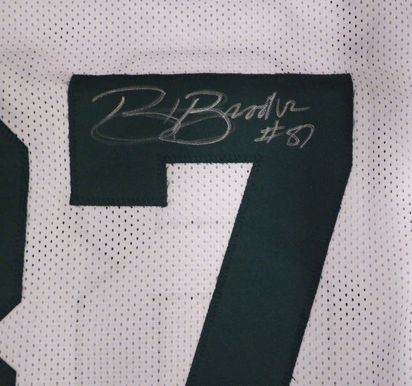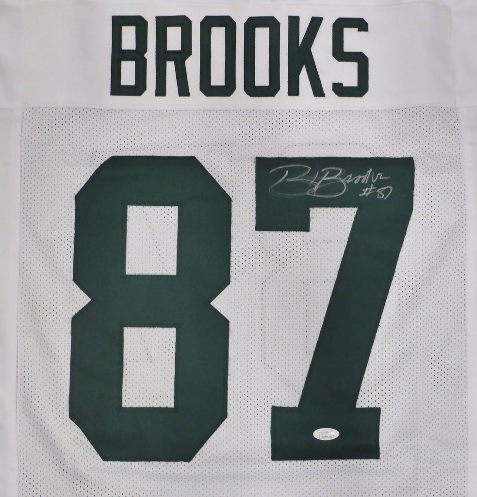 This is a White Jersey that has been hand signed by Robert Brooks. This is a custom jersey with no name brand. The approximate size is XL. It has nice sewn in name and numbers. There is an imperfection in the signature as shown. This item has been certified authentic by JSA and comes with their tamper-proof hologram and matching certificate of authenticity.