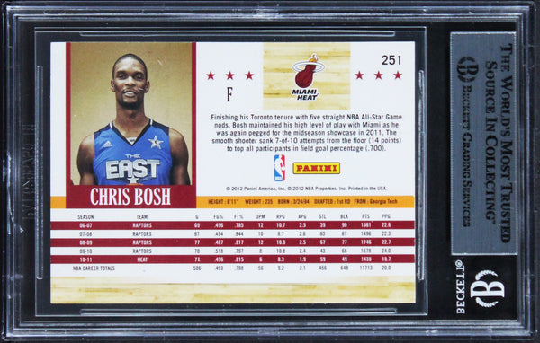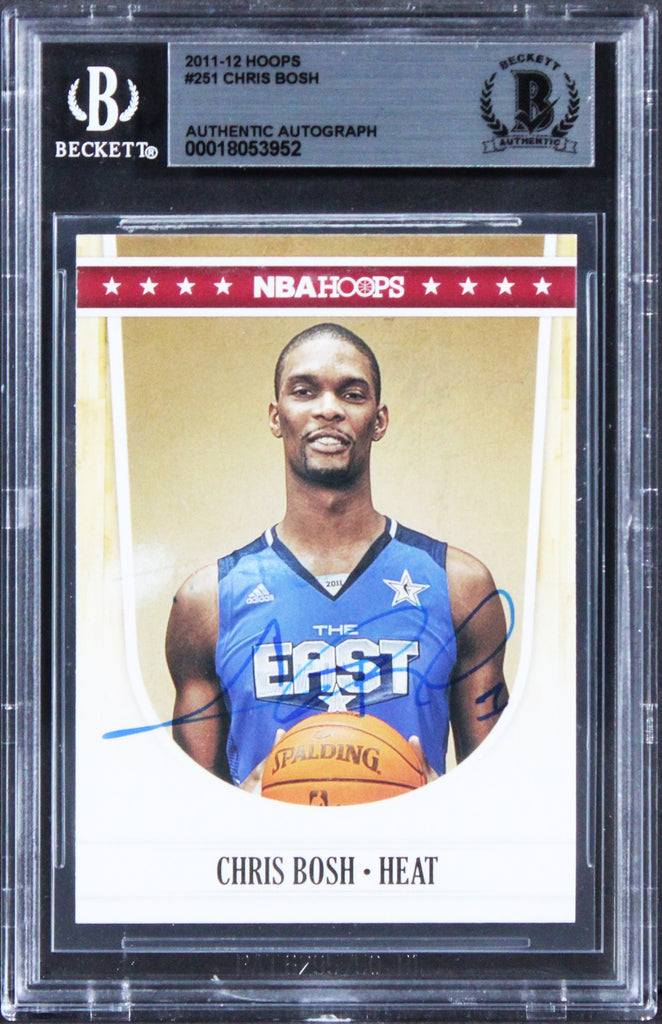 This Autographed 2011 Hoops #251 Card has been Personally Signed by Chris Bosh of the Miami Heat . This item is 100% Authentic, it comes slabbed and authenticated by Beckett Authentication Services. The authenticity can be verified on Beckett Authentication Services website.